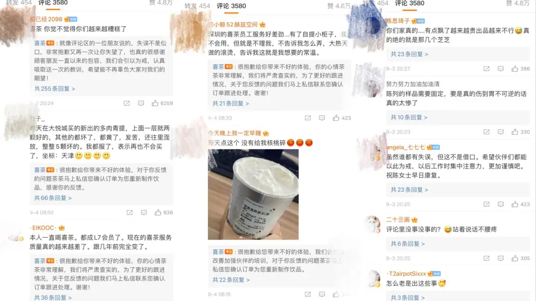 員工多次改口,這説明作為每家門店都會分發的飲品樣品,店鋪甚至對其成分都毫不清楚。除此之外,喜茶在事發後回覆陳女士的態度大多“含糊其辭”,充分體現了一開始品牌對這件事情並不重視。這都是喜茶的管理配不上其“地位”被詬病的點。