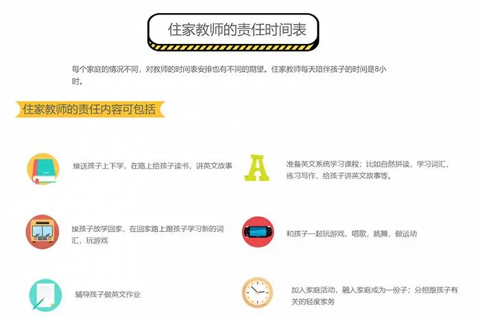 如廣州的招聘住家教師的要求中稱:要提供沉浸式英文環境、教孩子生活禮儀、陪伴閲讀及玩耍等等。具體還包括:英語專業、有國外留學經驗,口語好,會樂器優先。
