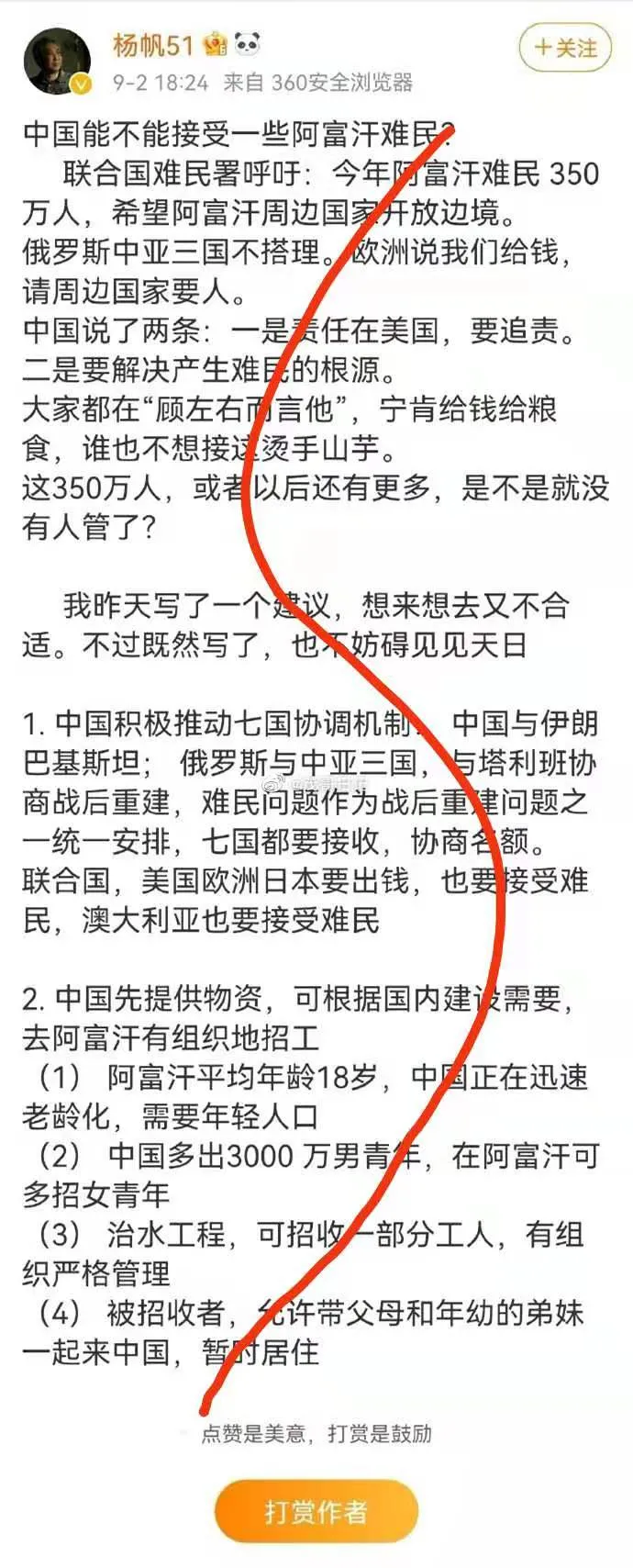好傢伙,在楊教授建議的方案裏,中國不但要接收阿富汗難民,還要“積極”,像幼兒園小朋友一樣積極主動,爭取多拿幾朵小紅花。
