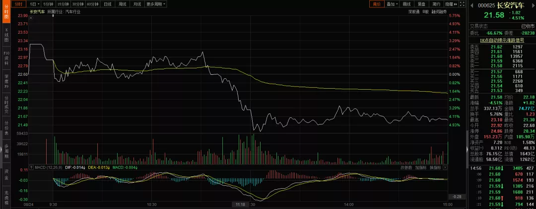 比失望跑得更快的是股價,發佈會一結束,長安汽車股價從高點跳水,最高跌幅達5.65%,至下午收盤下跌4.51%。