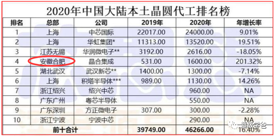 合肥其實還有一家晶圓代工廠。別小看這家企業,2020年中國大陸本土晶圓代工收入排名中,合肥晶合能排第四。