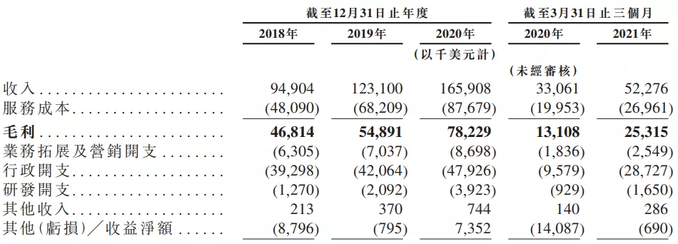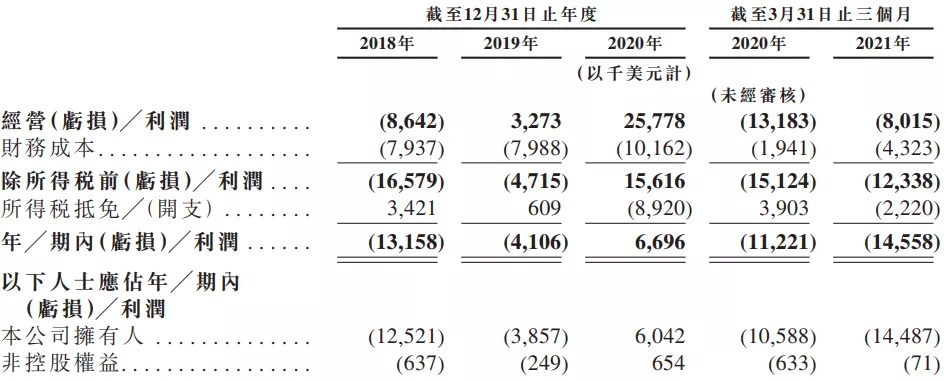 財務方面,於2018年、2019年、2020年及截至2021年3月31日止三個月,公司的收入分別為9490.4萬美元、1.23億美元、1.66億美元及5227.6萬美元。於2018年、2019年及截至2020年及2021年3月31日止三個月,公司淨虧損分別為1315.8萬美元、410.6萬美元、1122.1萬美元及1455.8萬美元,而2020年淨利潤為669.6萬美元。
