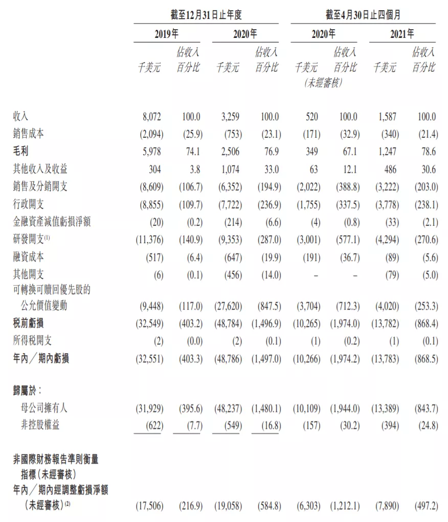 堃博醫療2019年、2020年營收期內虧損分別為3255萬美元 、4879萬美元;年內經調整淨虧損分別為1751萬美元、1906萬美元。堃博醫療2021年前4個月期內虧損為1378萬美元,上年同期的期內虧損為1027萬美元。