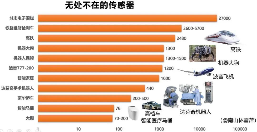 **傳感器的第二怪:種類繁多,但市場隱蔽。**國外成型產品及在研種類有3萬多種,我國有2萬多種。這些數量未必精確,但傳感器無疑是一個擁有龐大類別的產品。手機、汽車、工業測量、智能裝備等都是應用傳感器的大户,而這幾年風生水起的智能製造、工業互聯網,都離不開小小的傳感器。當然人工智能也不例外。可以説人工智能跑得再快,腳上穿着還是傳感器的鞋。