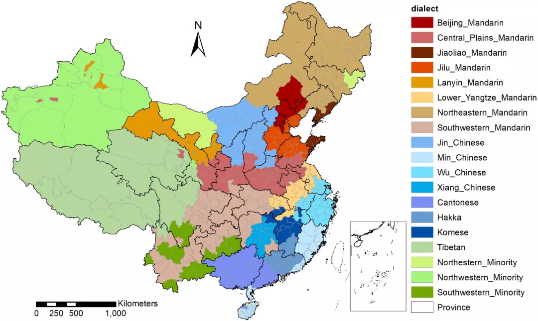 圖2:我國地級市層面一級方言、二級官話以及少數民族區域分佈 (Li et al. 2020)