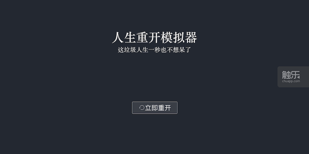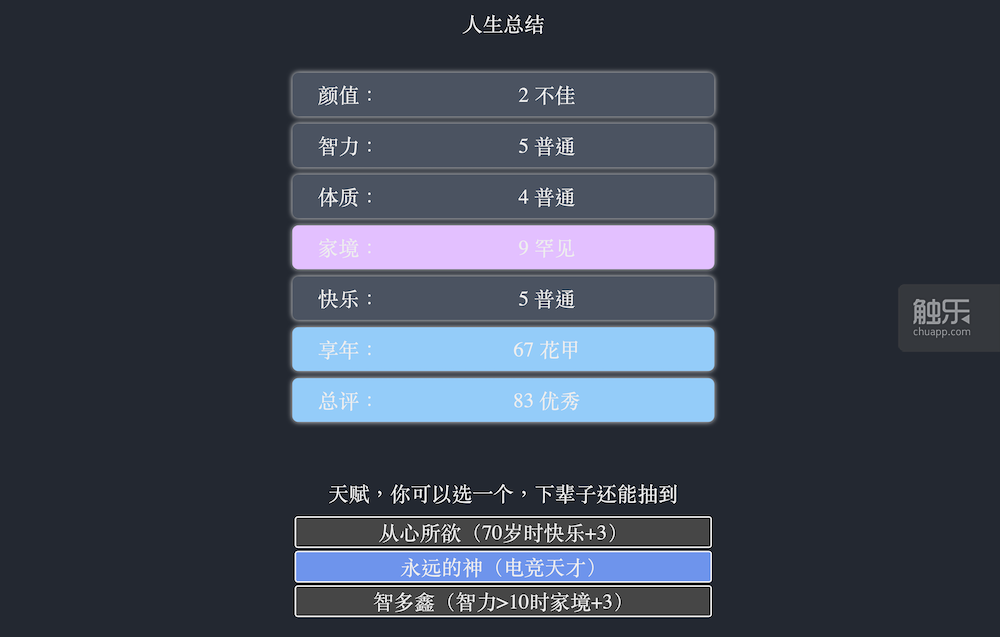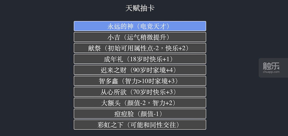 這個遊戲非常簡單。就如同它的名字一樣,在這裏你能讓人生一遍一遍重新來過——以一種相當簡陋的方式。在人生開始前,你隨機抽出10個天賦,為自己選擇其中的3個,並在顏值、智力、體質、家境中分配僅有的20個屬性點,然後你的虛擬人生就開始了。