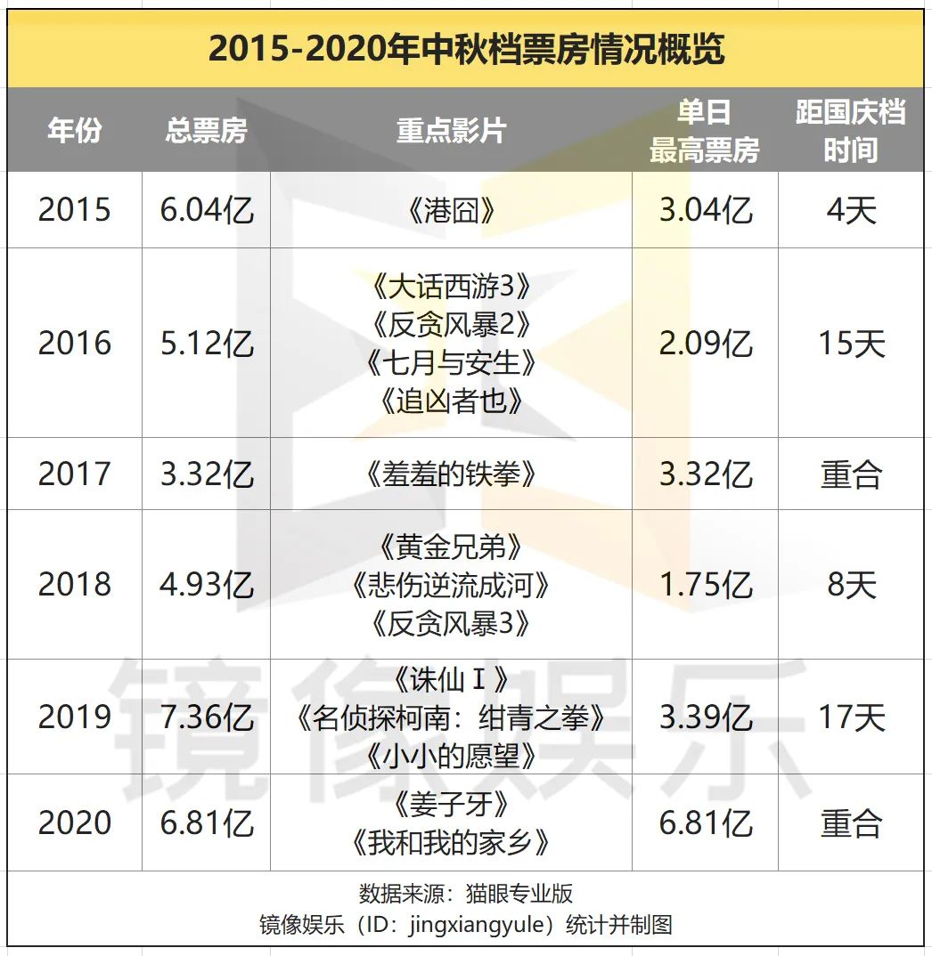 據鏡像娛樂統計,2015年-2020年期間,歷年中秋檔的票房區間在3-8億之間,整體浮動較大。出現這種情況的原因主要在於中秋檔時間不穩定,而距離國慶檔時間的長短,在很大程度上決定着中秋檔的票房表現。