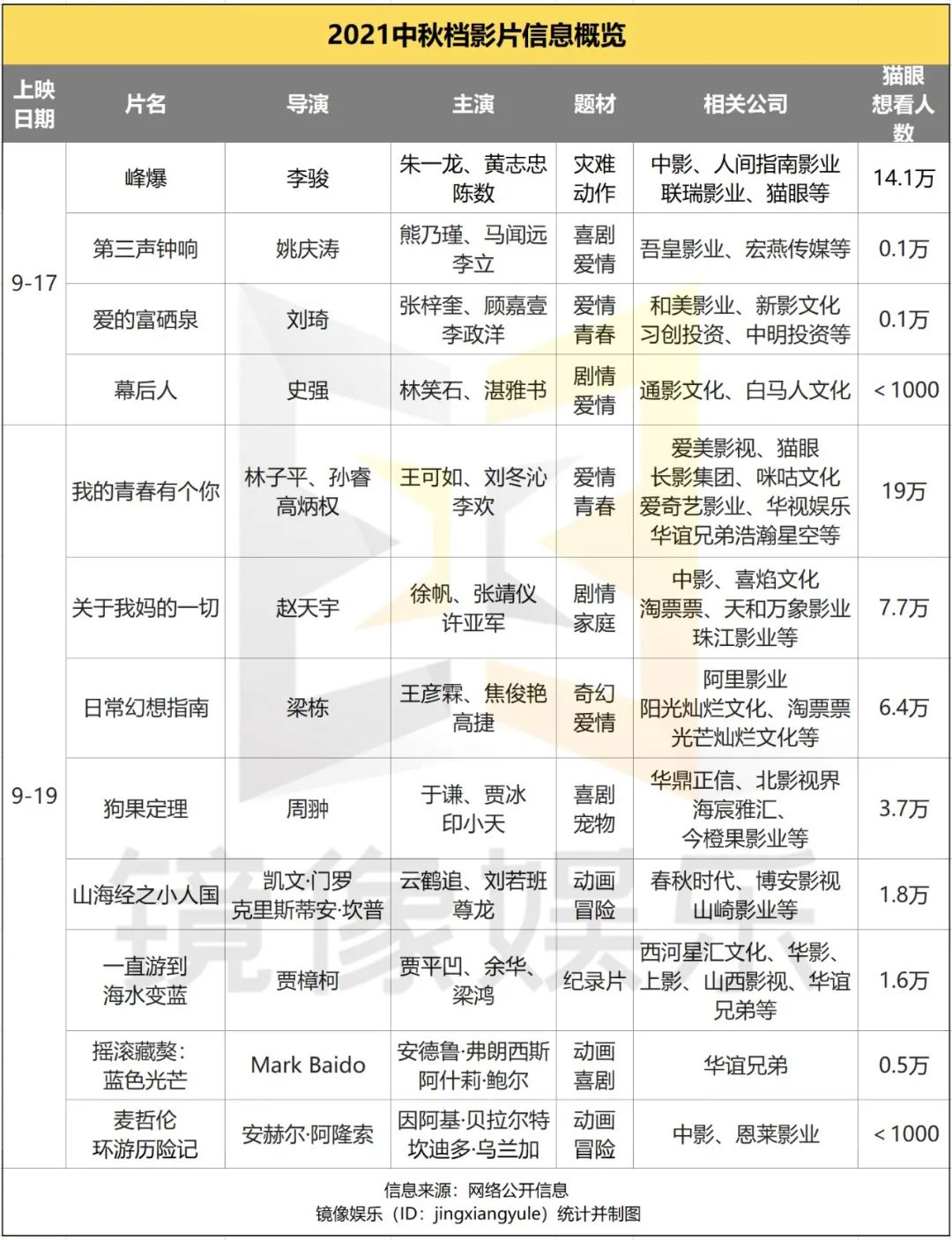 據鏡像娛樂統計,今年中秋檔共有12部影片上映,題材上以愛情片居多,但也覆蓋到災難、家庭、寵物、動畫、紀錄片等多種類型。