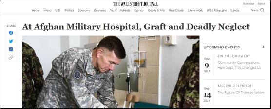 這篇報道提到了一個阿富汗警察阿里·努爾·哈茲拉特 (Ali Noor Hazrat),他在 2010 年底的塔利班火箭襲擊中受傷入院,為了賄賂醫護,他的兄弟拼命變賣掉家裏的土地,然而等他湊齊這筆錢的時候,哈茲拉特已經在醫院餓死。