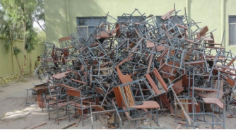 從未使用過的美援學校,嶄新的桌椅被堆在户外準備用作柴火
