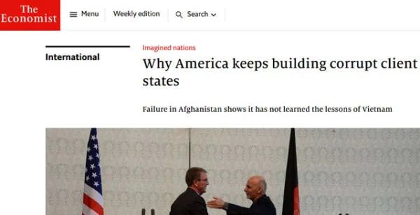《經濟學人》最近刊發了一篇文章,標題直接了當,就叫《為什麼美國“樂此不疲”地扶植腐敗的附庸政權(Why America keeps building corrupt client states)》,副標題是“在阿富汗的失敗表明美國並沒有吸取越戰的教訓”。