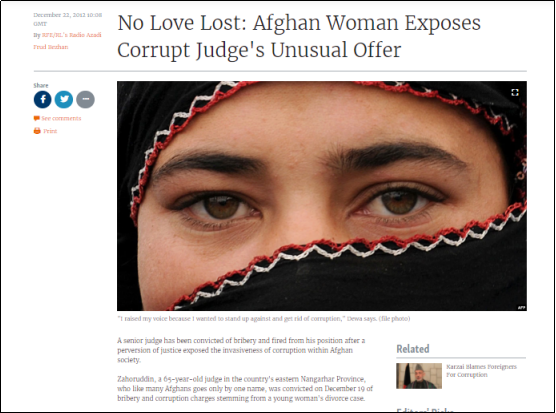 當然,如果沒錢,用色也不是不可以。2012 年的時候阿富汗一名22 歲的自由記者德瓦(Dewa)來法院申請離婚,一個叫查希爾丁的高級法官向她索要賄賂,被她拒絕之後,竟然又死皮賴臉地提出想要和她結婚,以此作為批准她離婚的條件。