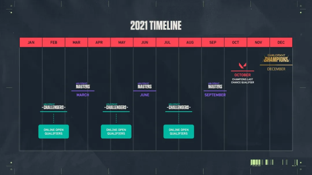 另一方面,VALORANT的熱度也得益於電競賽事建設的飛速進展。自2020年在海外正式推出後不到一年,拳頭遊戲便公佈了為期一年的VCT(VALORANT Champions Tour)賽事企劃,將官方比賽分為三種不同的賽事等級:挑戰賽、大師賽與冠軍賽。
