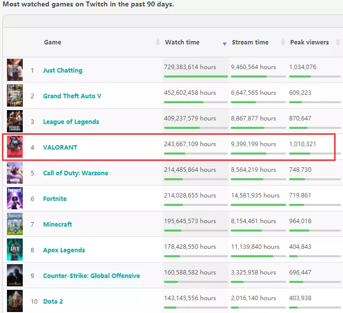 在過去一個季度中,VALORANT在Twitch TV直播內容觀看時長排名位列第四,整體觀看數據與《使命召喚:戰區》與《堡壘之夜》等FPS同類品處於同一數量級,在競技遊戲中甚至僅次於自家的老大哥《英雄聯盟》。