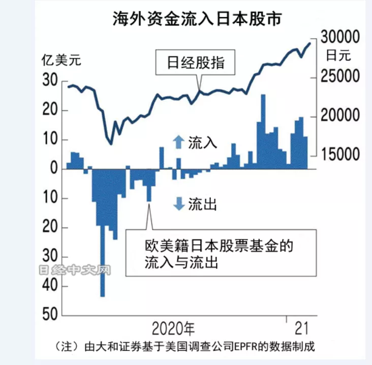 日本的財經新聞開始不斷向民眾宣稱,據美國調查公司EPFR的數據顯示,歐美籍的日本股票基金在2020年9月以後連續23周流入超過流出。進入2021年,流入59億美元,流入速度正在加快。SMBC日興證券的Trevor Hill也指出,“海外投資者正避開持續封城的歐洲,將資金投向日本”。
