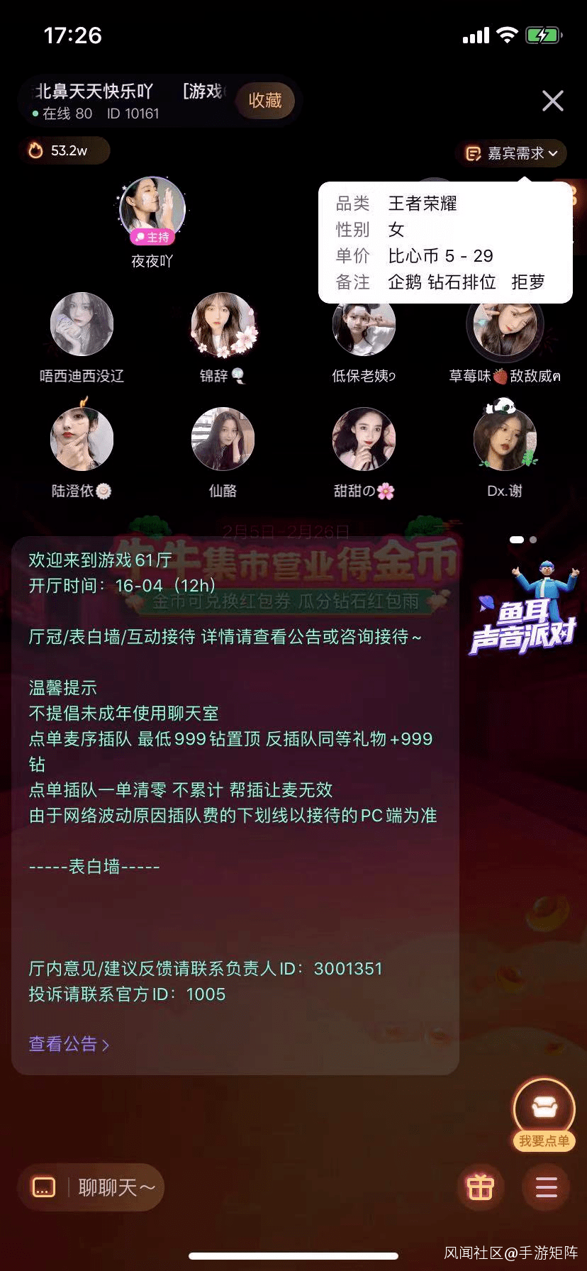 App上派單式的選妃則更為直觀,進入派單大廳,説完自己需求後,就會有覺得符合要求的陪玩來“跳單”,進大廳上麥挨着介紹自己,等着老闆選擇。
