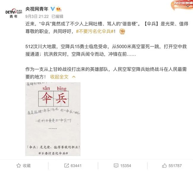 當然,説這麼多,並不是要正當化對於互聯網語言的使用。**很多詞的含義,是不應該被扭曲的。**舉例來説,“傘兵”這個詞的使用方式,就非常不恰當——共和國傘兵在過去幾十年的歷史裏,從未辜負過人民。任何一個稍微看過新聞,教育水平高過胎教的人,都應該記得在512時,十五位傘兵義無反顧的一跳。所以當下對於“傘兵”這個詞的誤用與濫用,不管從哪個角度來説,都應該被終結。