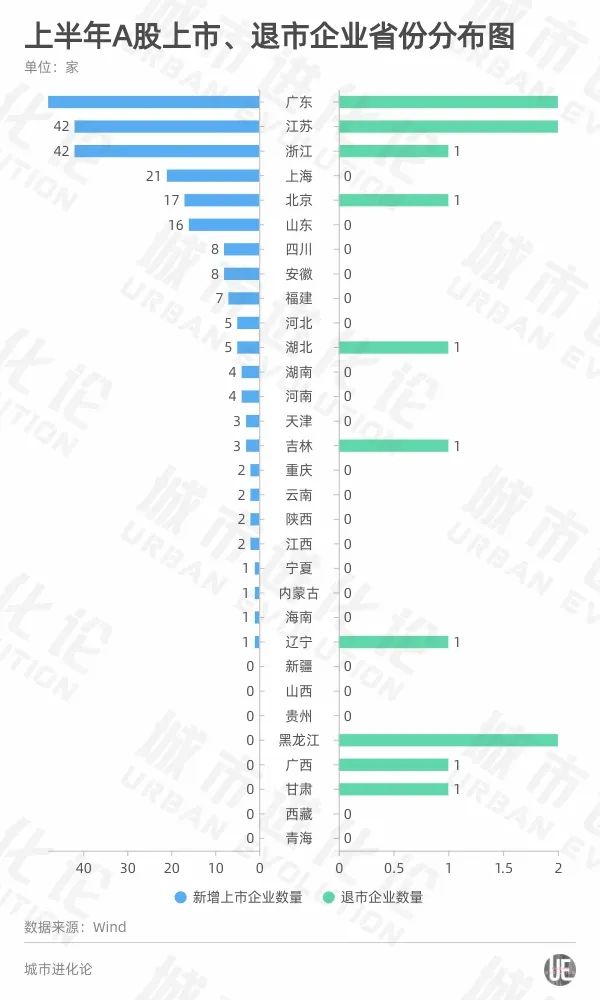 從省級層面來看,上半年有23個省(市、區)的企業登陸資本市場,廣東、江蘇、浙江毫無懸念地成為新增上市企業最多的三個省,達到48、42、42家。上海、北京、山東分別有21、17、16家新增。