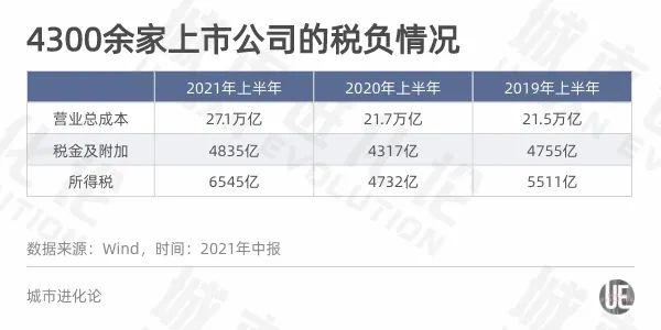 統計表明,上半年4300餘家上市公司承擔約4835億元營業税金及附加、6548億元所得税,税費負擔共計約1.14萬億。相較2020年上半年的9000億略有增加,與2019年上半年的1.03萬億基本持平。上半年,全國一般公共預算收入11.71萬億元,上市公司税費貢獻佔比約9.74%。