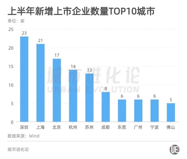 從城市層面來看(注:本文所説城市按wind所屬行政區劃(地級)分類,下同),深圳新增上市公司數量最多,為23家,上海、北京、杭州、蘇州分別有21、17、14、13家企業登陸資本市場。