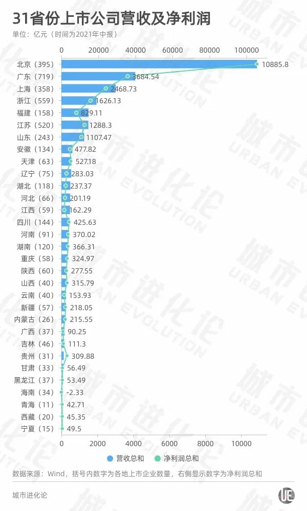 從上圖中可以看到,今年上半年北京10萬億的總營收由轄內395家上市公司所貢獻。排名第二的廣東,719家上市公司的總營收才近4萬億元。相比之下,廣東企業數量比北京多出80%,總營收卻比北京少了60%。