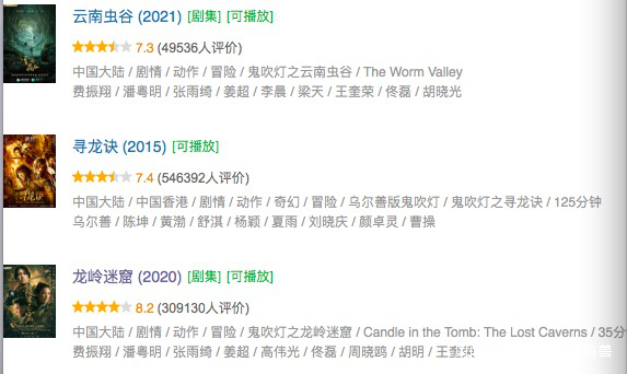 正在播出的《雲南蟲谷》,再次在市場上引發了“盜墓熱”,雖然7.3分的豆瓣評分較之去年的《龍嶺迷窟》有所下滑,但無可否認近年來“鬼吹燈IP”的市場認可度和好評度正在逐漸走高。當然這也得益於企鵝影視一口氣買下了八部小説的網劇改編權,原班人馬、品質加持、穩定的觀眾基礎,“鬼吹燈宇宙”正在成型。