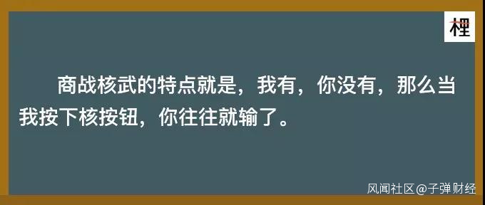 而對於商業戰爭來説,這種情況就越發的複雜。其複雜性不但站在如何使用核武,也在於“核武”的獲得相對更加容易,在一場商戰中多方反覆使用核武的現象也越來越多,那麼,對於一個按下發射鈕後就無法控制結果的武器,我們該如何掌握戰爭的規律呢?
