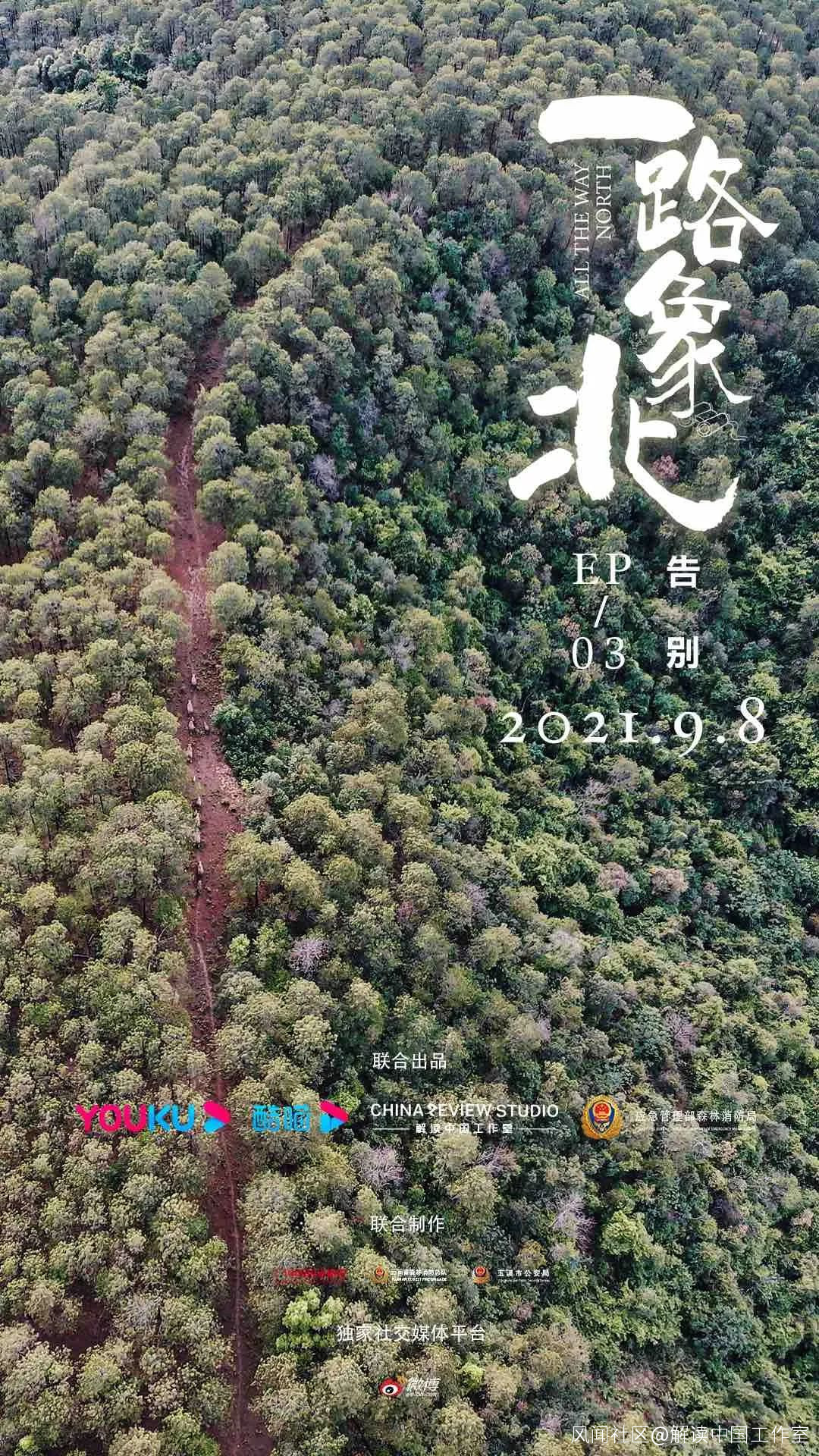 **8月25日,解讀中國工作室攜手優酷、中國應急管理部森林消防局聯合出品的系列短片《一路“象”北》在優酷視頻上線播出。**從一路護送大象的特警、消防人員,到與大象相遇的村民,從現場指揮部的專家到西雙版納自然保護區的“象爸爸”,節目全方位呈現真實、解答疑問,以前所未有的視角記錄了一次特殊時期的象羣遠行,探討大象遷徙背後折射出的生態保護議題。系列第三集《告別》9月8日上線,感受“護象隊員”與“小短鼻家族”的相識、相知、相聚和分離。