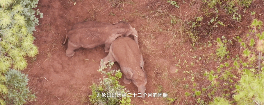 “大胖”和“小胖”是在象羣北上的旅途中出生的。母象一般需要經歷二十二個月的懷胎才能迎來一隻幼崽,而雌象的繁育間隔在五年以上,因而象寶寶一出生就會受到家族最高級別的關注。為了讓小象睡得安心,象媽媽會摘樹枝為象寶寶們驅蚊,或是鼓動大耳朵扇風。