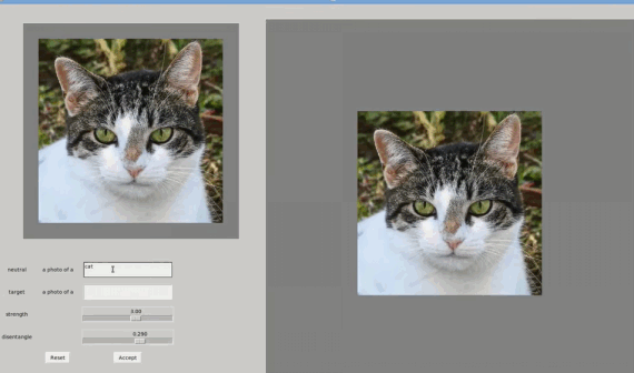 舉個例子,如果想要讓下圖這個眼神兇兇的貓變得可愛一點,僅需輸入“cute cat”,貓就會往可愛的那方向自動改變了,然後還能進行微調。