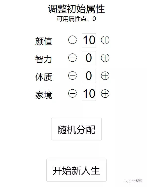接着是分配初始屬性,通常玩家一共有20點點數可以分配,當然也可以點“隨機分配”省時間,這裏姬選擇了和自己相符的顏值,以及感覺會開局不錯的家境。