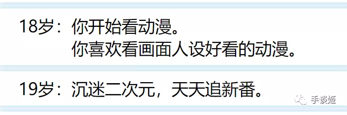 過了17歲,手談姬終於在遊戲中18了,遊戲説姬開始看動漫,還是個人設黨。到了19歲就成了個二次元……