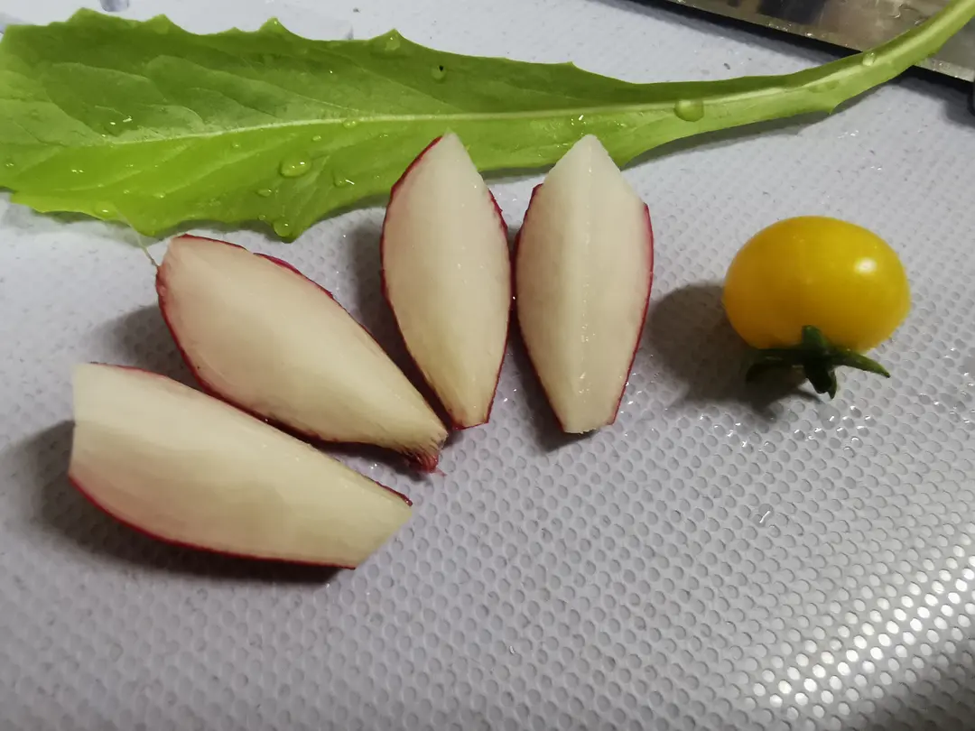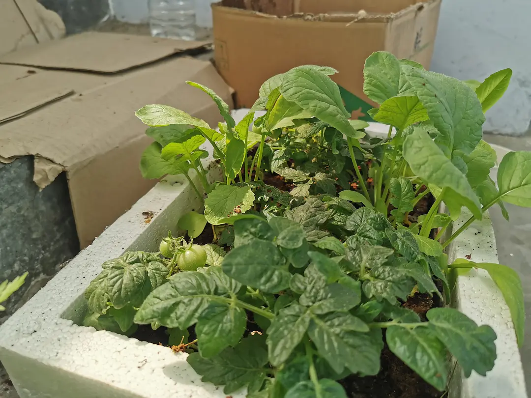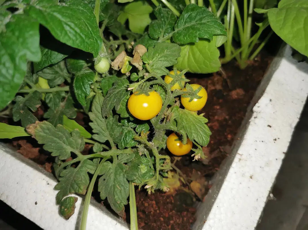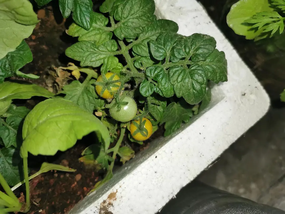 撿了個泡沫箱種櫻桃蘿蔔和矮種番茄(這種番茄不好吃,但好看,結的果也多)