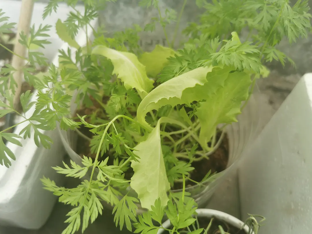 比如2L的礦泉水桶,剪一剪、底部鑽幾個洞,再填上土,就可以種植生菜了。