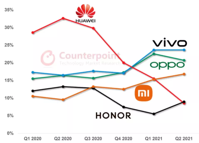 根據Counterpoint公佈的最新數據顯示,vivo以24%的市場份額位居中國智能手機市場第一位。值得關注的是,這已經是vivo連續五個季度高居中國市場首位,並且與其他品牌的份額優勢還在拉大。