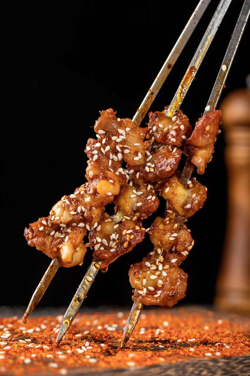 當然,也有人拿來烤的,簡簡單單用雞蛋、皮牙子(洋葱)和鹽混合的汁水醃製後明爐燒烤。雞蛋是用來上色增香的,為羊肉表面裹上一層焦黃色的香脆外衣;鹽是用來上味的,同時能讓蛋白質轉性,讓瘦肉更有嚼勁;皮牙子則是用來祛羶的。三種醃料職責分明,結構清晰。