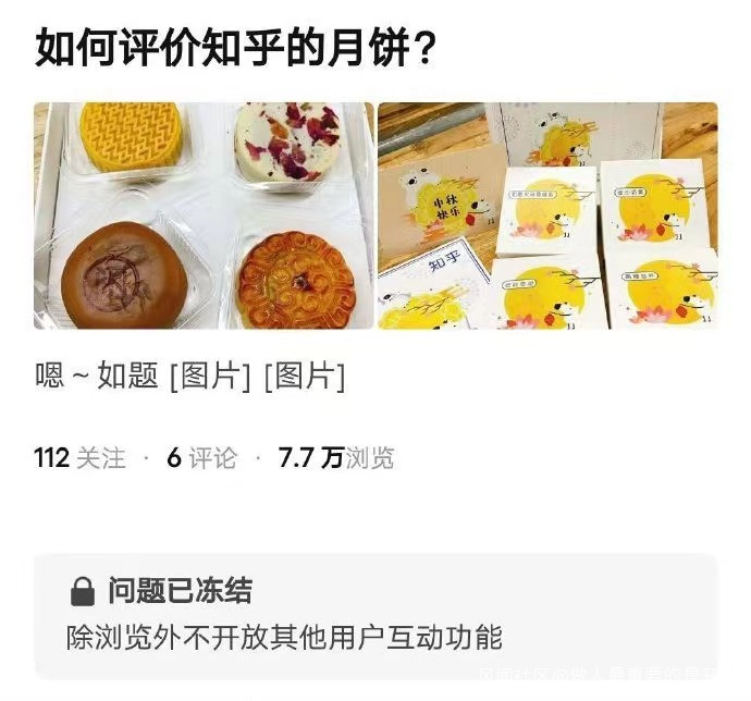 包括「如何看待知乎2021中秋月餅造就噴射戰士?」以及「如何評價知乎的月餅」,這個問題也被凍結了不開放互動。