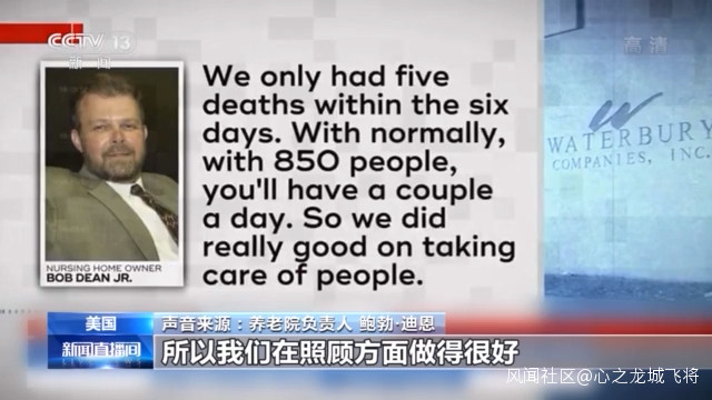 養老院負責人 鮑勃·迪恩: 6天內我們只死了5個人,一般來説,將近850個住户,可能每天會有幾個(人死亡),所以我們在照顧方面做得很好。