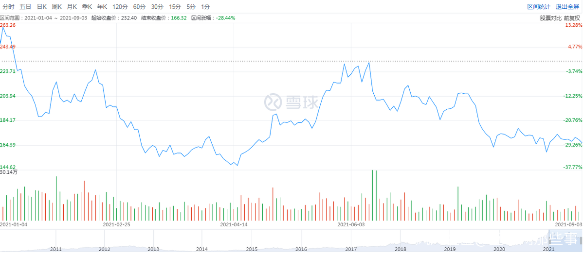 股價上體現得更明顯,今年以來,洋河股份股價持續下跌,年初股價還在263.26元/股的高點,但截至9月3日收盤,股價已跌到166.32元/股,累計跌幅達到了36.8%,市值今年從最高點跌去了1460億,在釀酒行業個股中排名僅在第五位,已被山西汾酒和瀘州老窖超過。