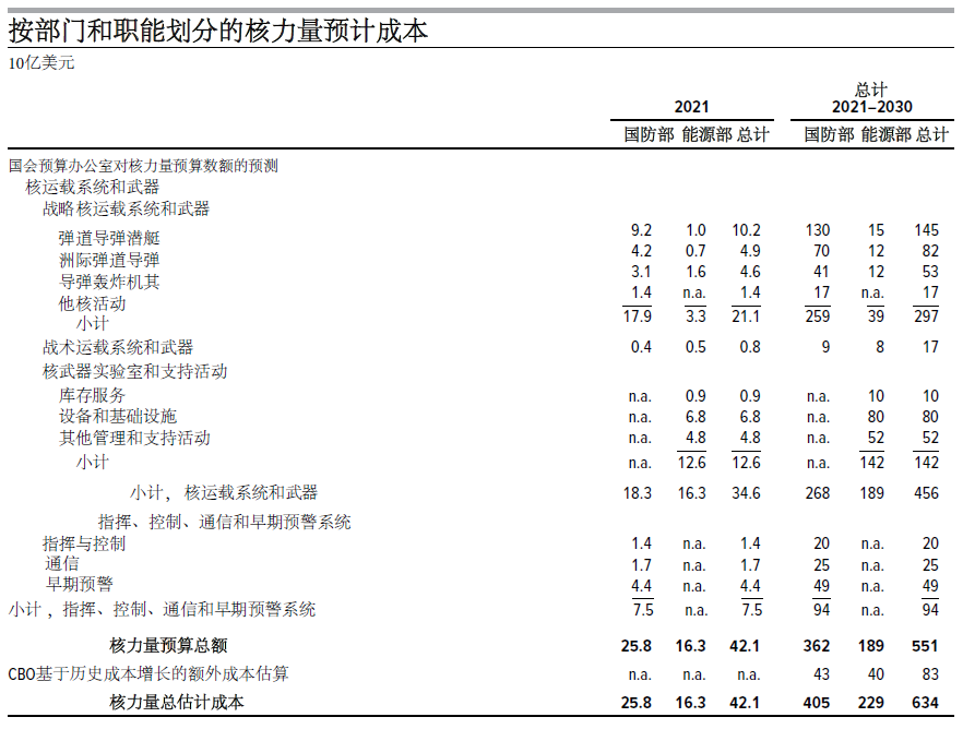 最近一次是2021年,CBO對2021-2030年期間高達6340億美元的美國核力量預算分配見下表:
