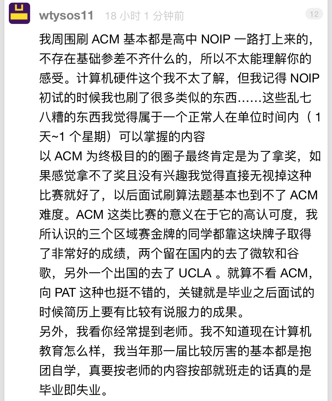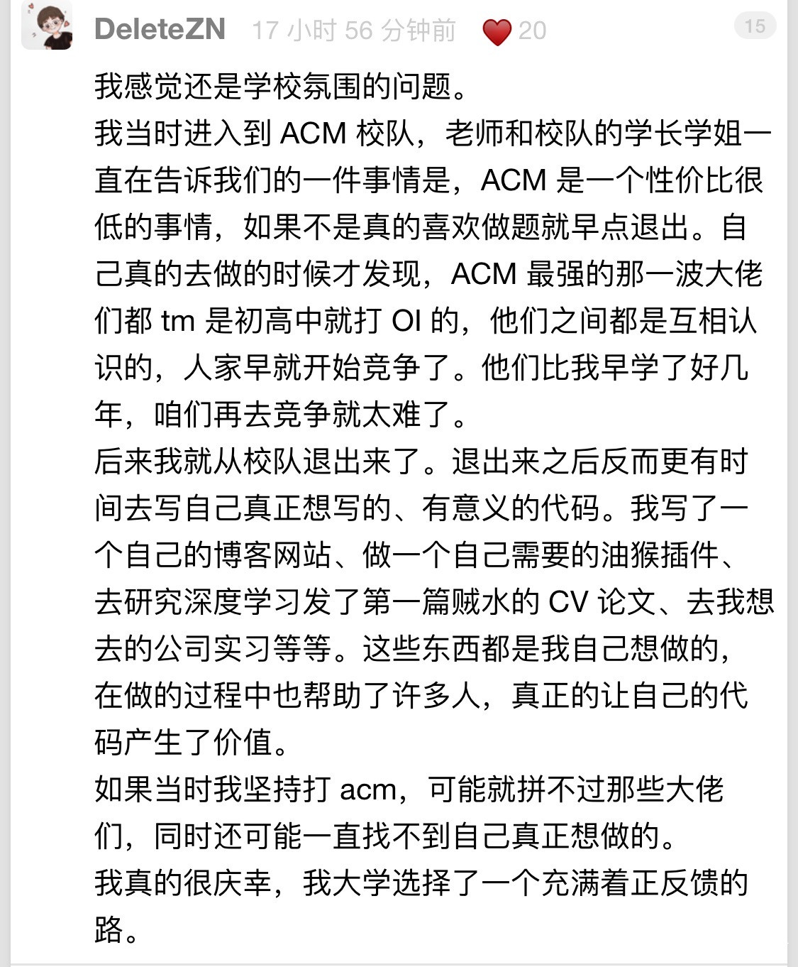 ACM是一個性價比很低的事情,如果不是真的喜歡做題就早點退出。自己真的去做的時候才發現,ACM最強的那一波大佬們都tm是初高中就打Ol的,他們之間都是互相認識的,人家早就開始競爭了。他們比我早學了好幾年,咱們再去競爭就太難了。後來我就從校隊退出來了。退出來之後反而更有時間去寫自己真正想寫的、有意義的代碼。
