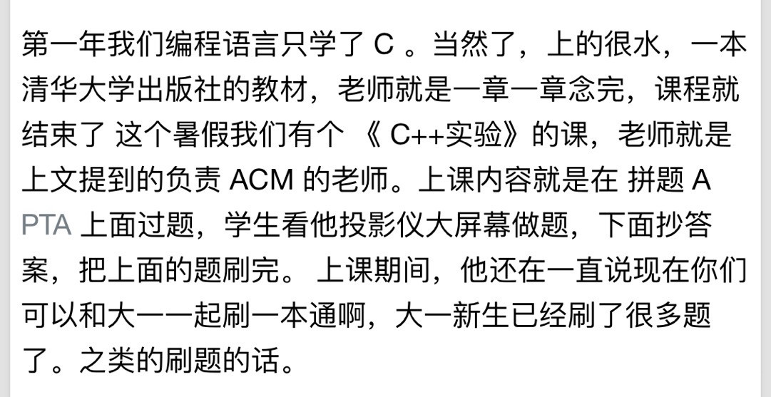 有網友説,他在大一的時候編程只學了C語言,老師只拿着教材一章一章唸完,上得很水。也是強調刷題刷題,學生看他在大屏幕做題,他念答案。