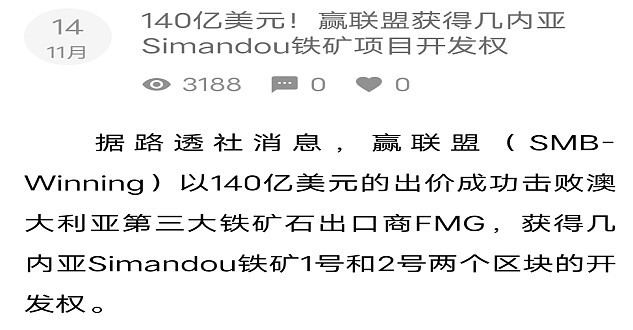 為了和澳洲巨頭FMG公司競爭,以山東魏橋、煙台港集團、宏橋集團為主的中國企業決定和法國、新加坡企業合作,一同組建了一個“贏聯盟集團”,向幾內亞政府送上了標書。