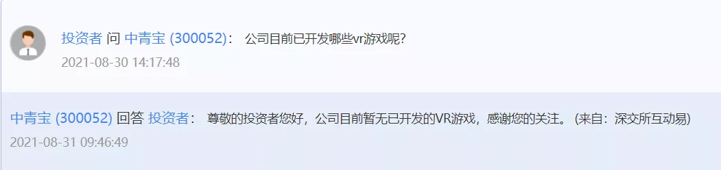 對此,中青寶8月31日在投資者互動平台表示,公司目前暫無已開發的VR遊戲。