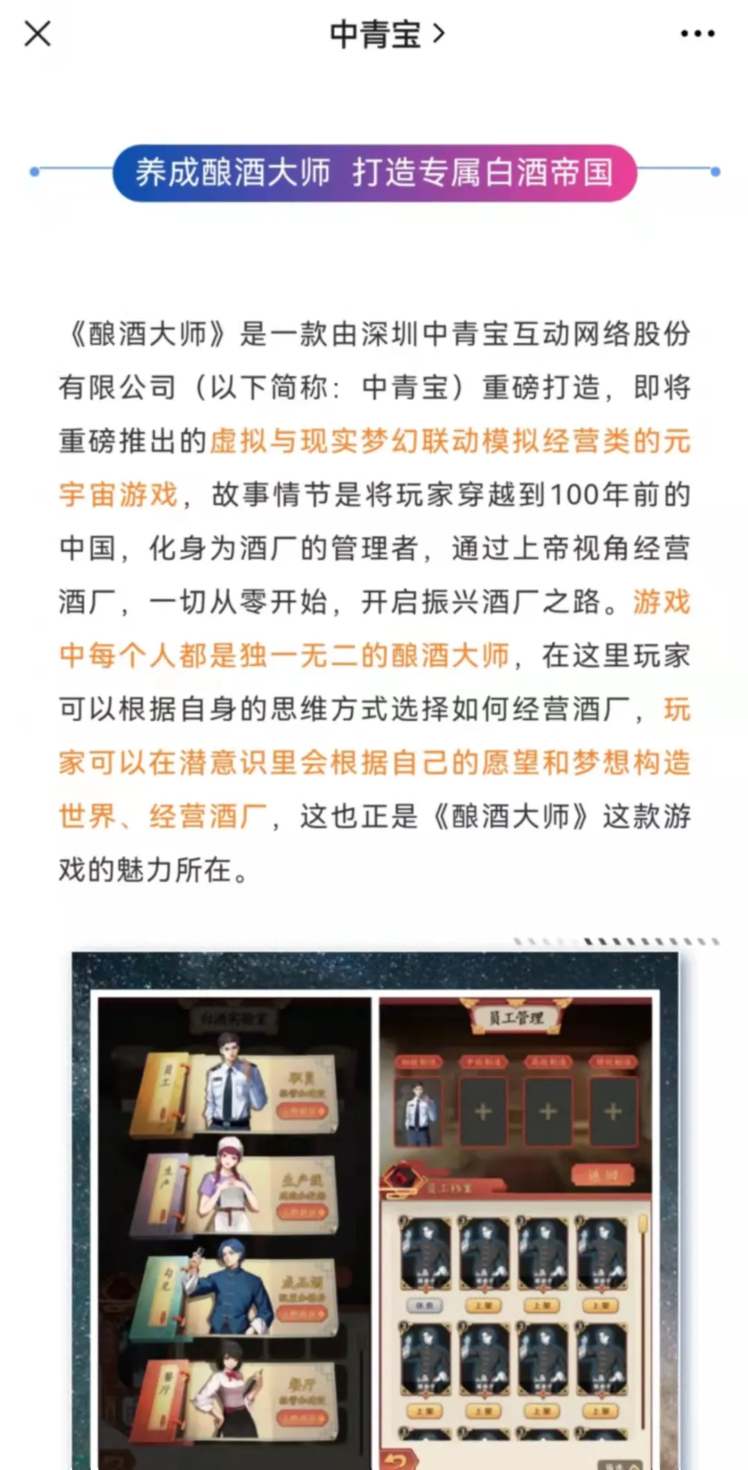 消息面上,6日,中青寶官方微信號消息,公司將推出虛擬與現實夢幻聯動模擬經營類的元宇宙遊戲《釀酒大師》,這是一次打破次元壁的嘗試,遊戲與真實邊界開始走向消融。