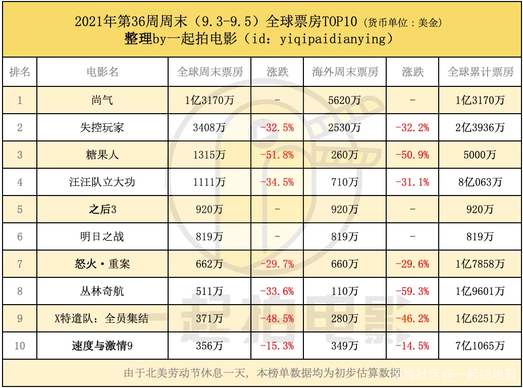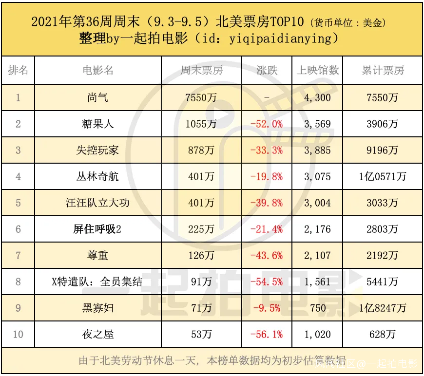 但是《尚氣》最終還是憑藉較高的口碑超出預測30%的拿下冠軍,捍衞了MCU宇宙作為商業爆款的尊嚴。在北美以2.5倍的成績刷新了《月光光心慌慌9》保持了14年的檔期記錄,還超過了《速度與激情9》,成為疫情以來第二高開畫。