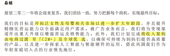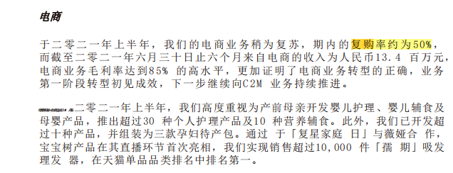 日前,寶寶樹提出“三生萬物”企業戰略,其中,C2M是一大重要商業佈局。2021半年報指出,寶寶樹的C2M業務集團在產品供應及營銷策略方面取得突破,上半年電商業務毛利率達85%,證明了電商業務轉型的正確,業務第一階段轉型初見成效。但在描述上半年電商業務時,寶寶樹依然較為謹慎地使用了“稍為復甦”“輕微好轉”的字眼。