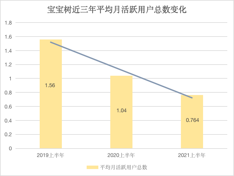 在平均月活總數上,上半年,寶寶樹的平均月活躍用户總數為7640萬,而2019年上半年、2020年上半年其平均月活總數分別為1.56億、1.04億。很明顯,近三年,寶寶樹的用户增長呈不斷下降趨勢。