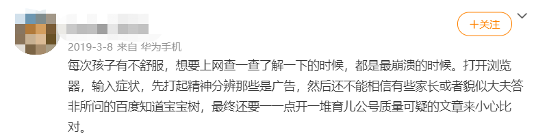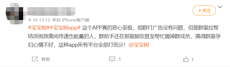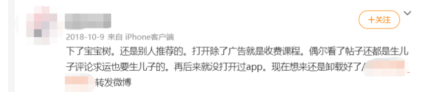 有用户反饋,一打開寶寶樹就會看到各種婆媳問題、生男生女問題,負能量過剩。而且知識內容混亂,答非所問,甚至關於同一問題,其不同終端的説法相互矛盾,用户對其體驗感和信任感大打折扣。而且在廣告壓力下,有限的頁面裏越來越多廣告,頻繁的推送,急於變現的吃相正在進一步透支用户的好感。