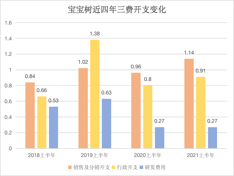 在吸金能力尚未恢復元氣,持續虧損的情況下,寶寶樹的三費開支卻出現小幅上漲。2021上半年,公司銷售及營銷開支為1.14億元,同比增長19.47%,一般及行政開支為9069.4萬元,同比增加13.25%。控制得較好的反而是研發費用2749.3萬元,同比增加2.3%,與2019上半年相比,更是大幅下降56.5%。